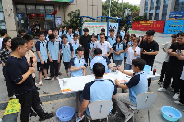 隨著清脆的哨聲,一場別開生面的“蒙眼倒水接力”率先上演。這是一個體現(xiàn)學子們勇敢與身手敏捷的游戲。每當有人成功將水倒入后面的水盆中時,周圍立刻爆發(fā)出陣陣歡呼與掌聲,參與游戲的同學那份成就感與喜悅,在夏日的空氣中久久回蕩,仿佛帶大家回到了純真無邪的童年時光。